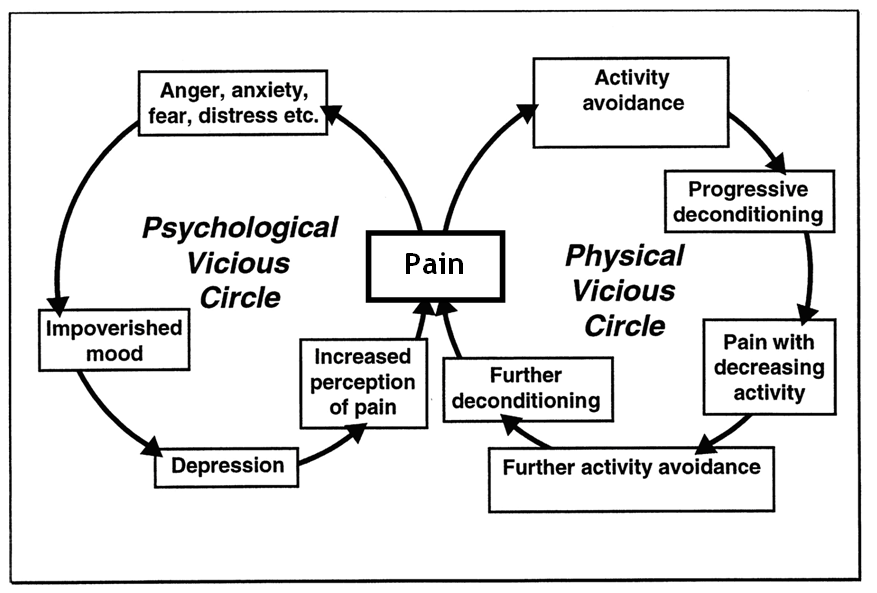 Those who suffer from anxiety or depression often withdraw socially, becoming irritable to those around them. This loss of social support, interaction and activities often exacerbate the symptoms of anxiety or depression, further accentuating pain. A study by psychologist Kati Thieme and colleagues at the University of Washington found that patients with fibromyalgia, an illness that has no identifiable source, who also had an anxiety disorder reported more physical symptoms, impairment in life functioning and the highest levels of pain in comparison to their mentally healthy counterparts.