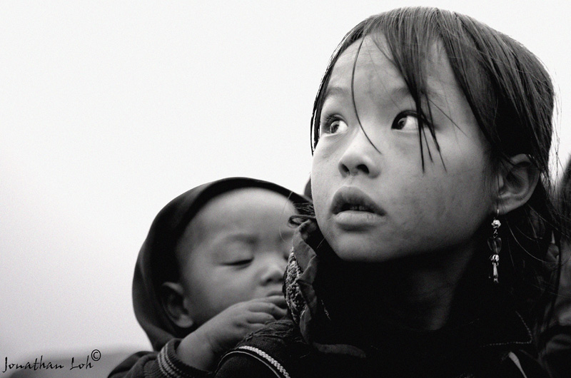 With a heavy burden of her younger sibling on the back, this young native H’mong girl of Sapa, Vietnam, braves the treacherous mountainous terrain alone everyday in freezing temperatures on a long journey to the nearby town, in hopes of finding any forms of labour for much needed money and supplies.