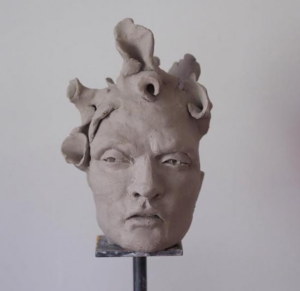The following sculpture is created by multidisciplinary artist Charlotte Sigurdon and is a part of their “life and damage” art collection. With the use of Raku clay, we see the sculpture of a head with what appears to be different shapes of scarring around its head. The expression of the face appears emotionless, thus attention is focused on the swirling scars it possesses.